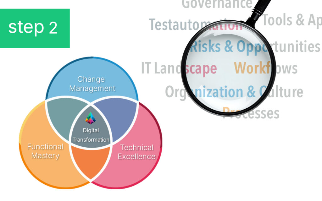 At this stage, we take a closer look at the organization to evaluate maturity levels across key areas. By working closely with the client, we map out the impact of the upcoming changes in three critical dimensions. This insight helps us determine the specific skill sets and expertise required to drive the digital transformation forward.