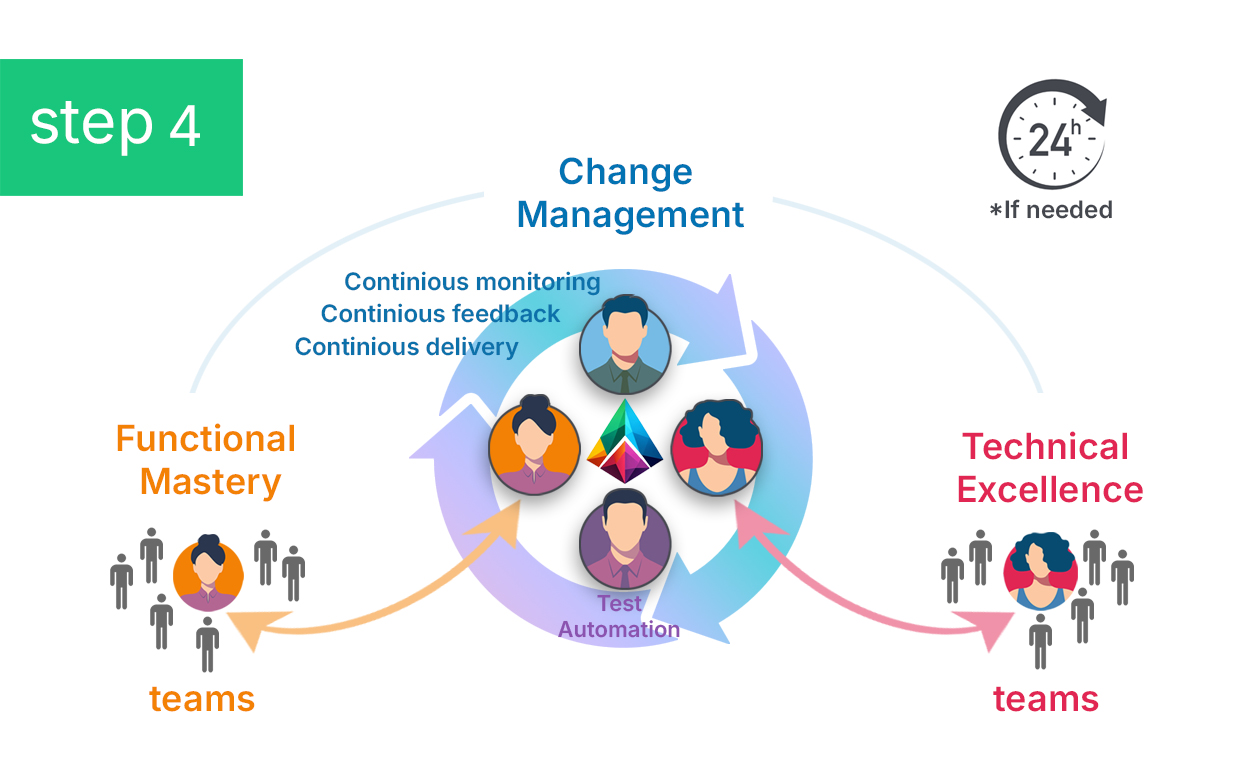 By embedding ourselves across various functions, we ensure Technical Excellence by implementing high-quality testing processes, ensuring every solution is robust and reliable. Simultaneously, we focus on Functional Mastery, optimizing processes across the organization to guarantee peak performance, while keeping all stakeholders aligned. Throughout this process, we remain committed to Change Management, working alongside your team to embrace innovation and adapt to evolving needs, ensuring that transformation efforts, including team ownership, are supported at every level.